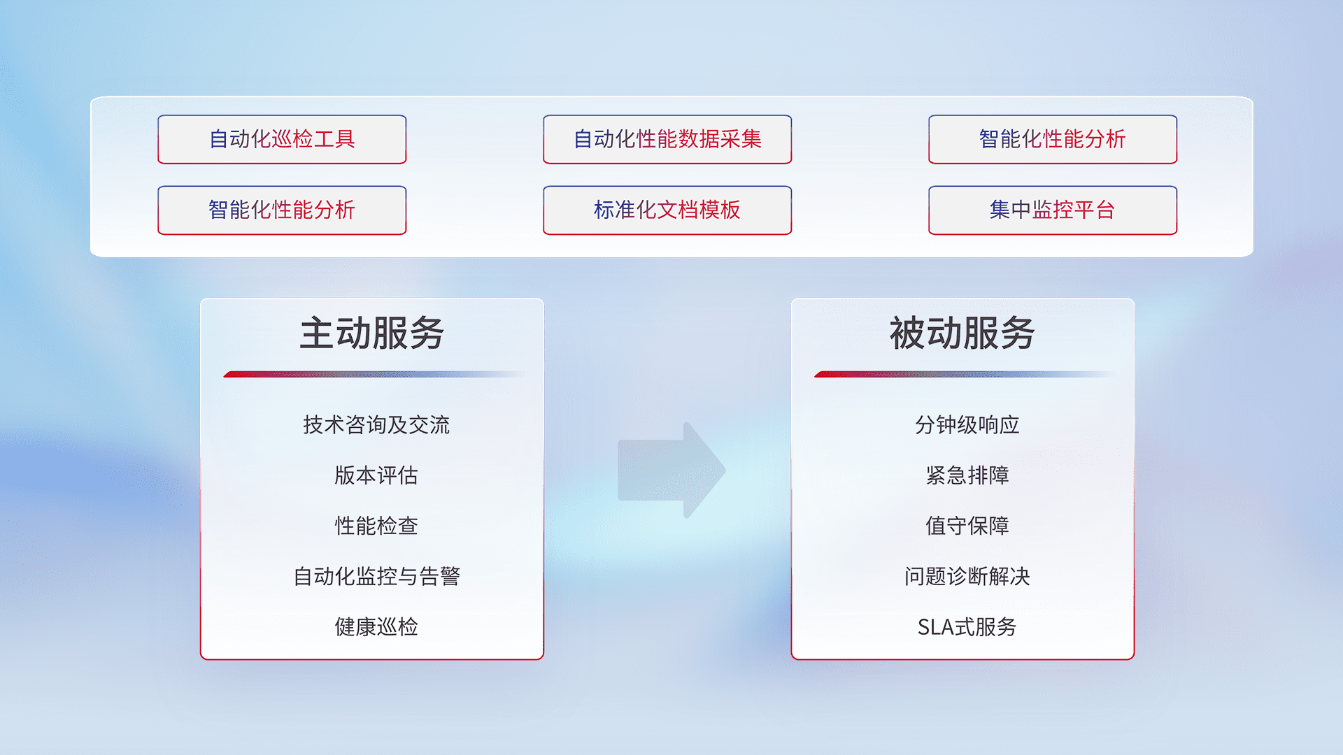 智能化工具和标准化文档,,保障服务质量,,,提供主动服务(包含技术咨询、、版本评估、、性能检查、、、、自动化监控与告警、、健康巡检)和被动服务包含(分钟级响应、、、紧急排障、、、、值守保障、、、、问题诊断解决、、SLA服务)。。。。