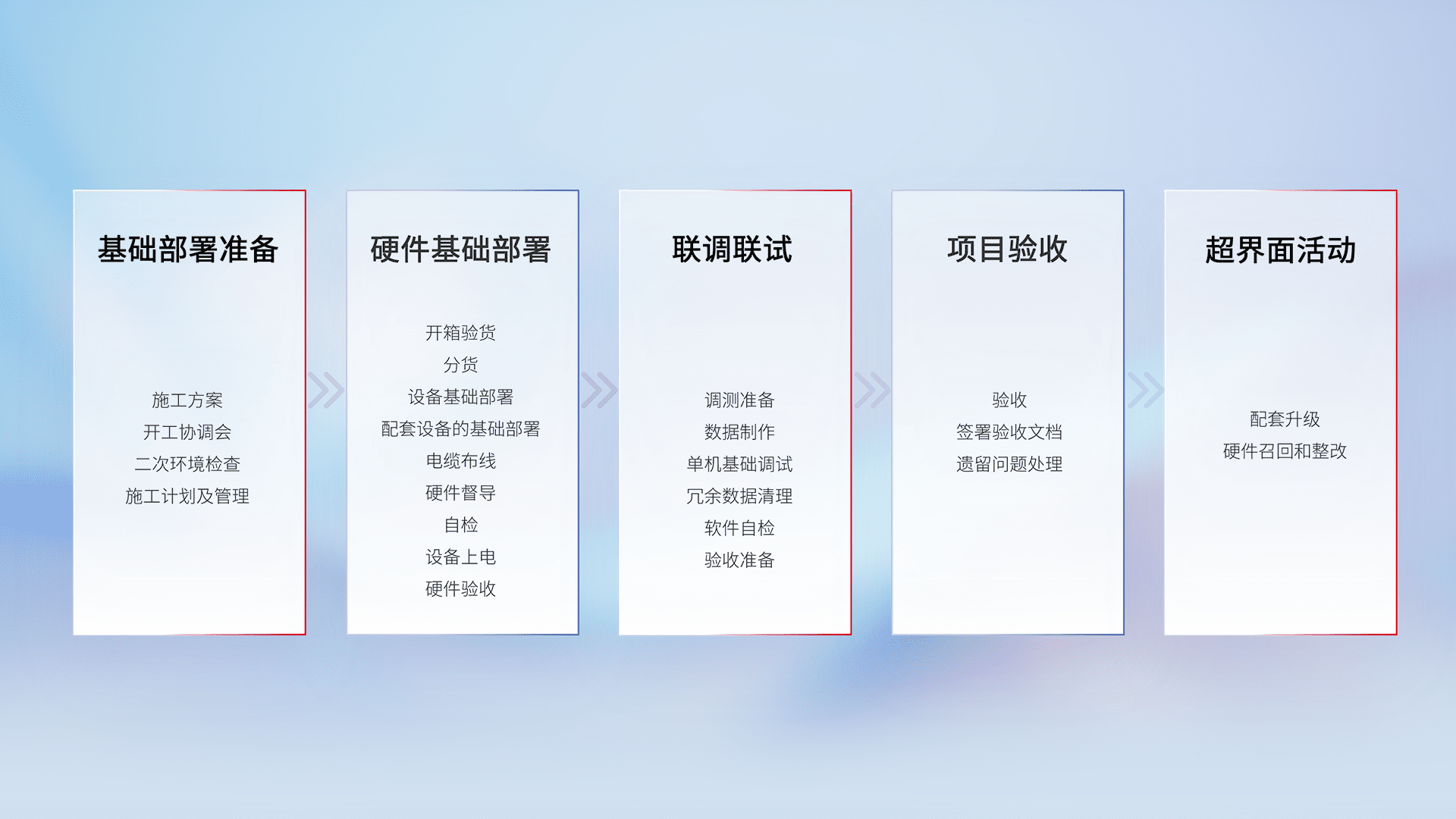 从基础部署准备、、硬件基础部署、、、、联调联试、、、、项目验收、、越界面活动的全过程可追溯,,,,保证施工质量和进度。。。